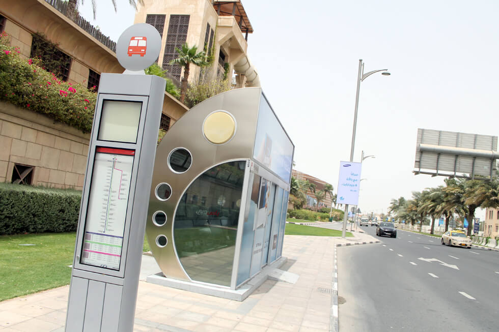 Dubais busshållplatser ser ut som små rymdskepp. Aircondition finns i alla! The bus stop is a spaceship with aircondition…