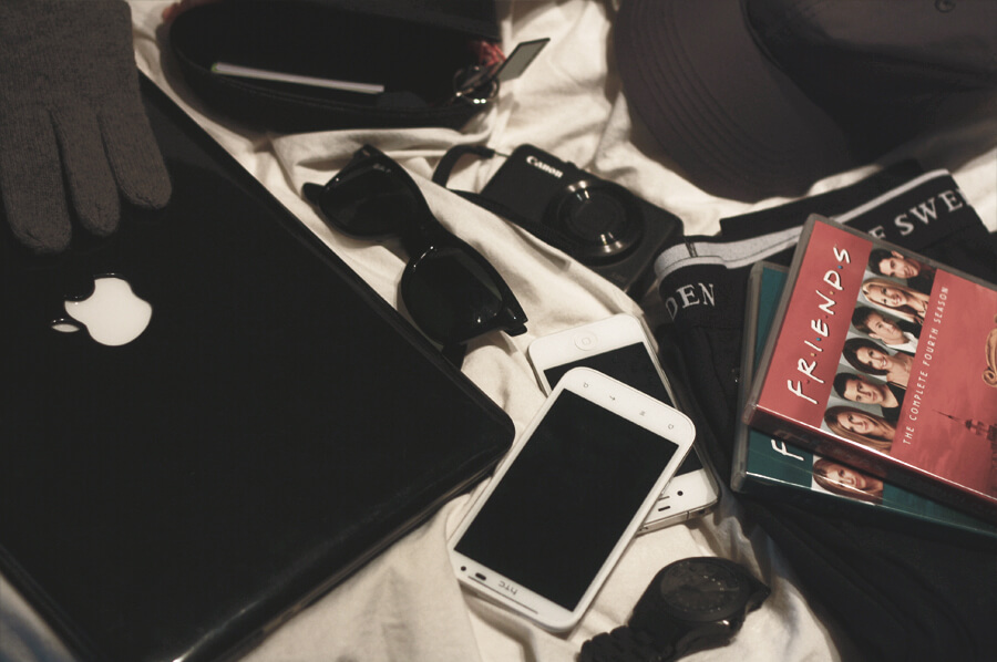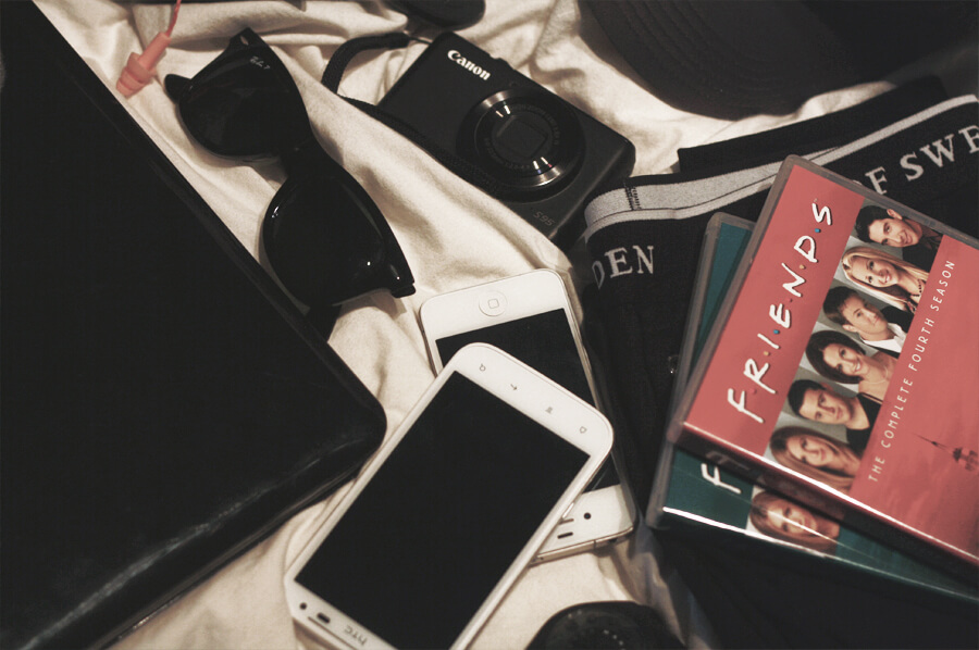 Vantar från Acne, nycklar, min HTC, min iPhone, klocka från Marc Jacobs, två säsonger av Vänner, mina Ray Ban, långkallsonger från gasello.se, keps från The Local Firm, dator, busskort, öronproppar och självklart min kamera.