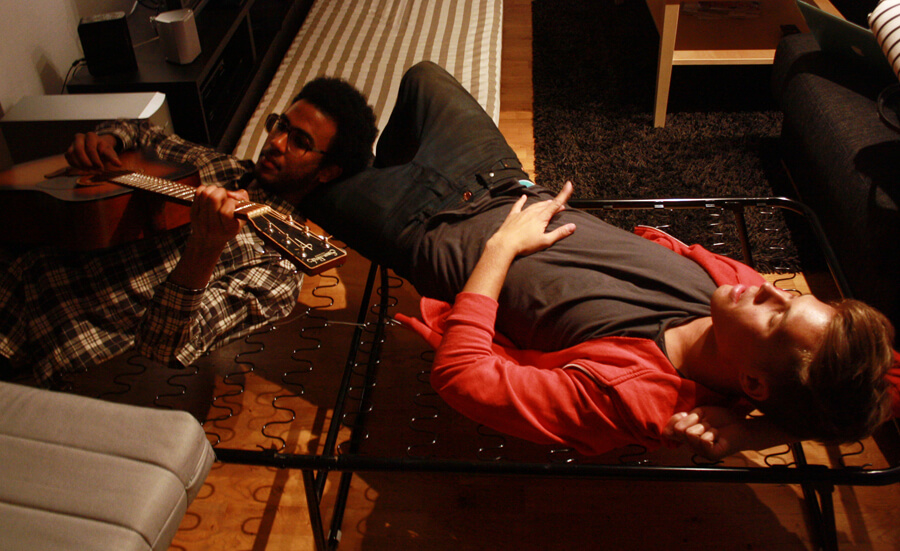 Nu hänger vi hos vår nya vän och packar upp sängar.