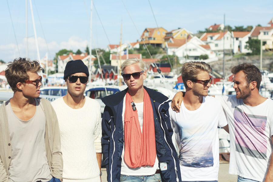 På den nioende bilden från allra första bilden, där ni står alla 5 killar irad, vad heter killen imitten som har ljust hår med marinblå jacka och scarf?